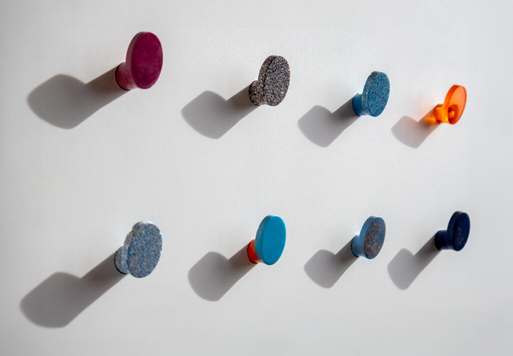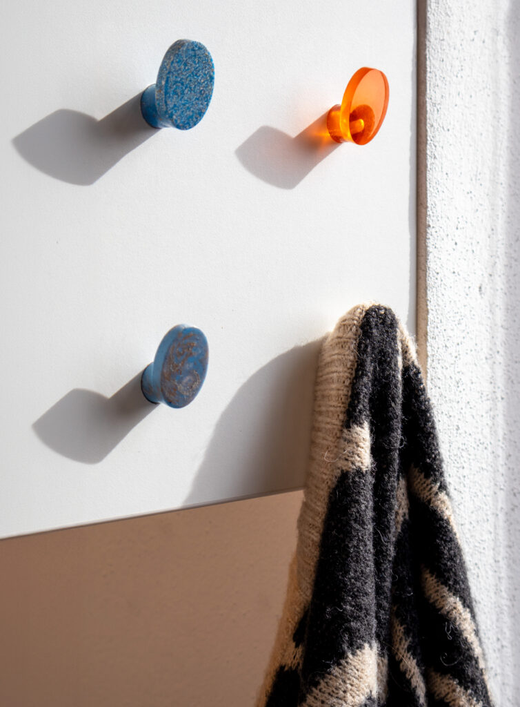 Die Serie „Fenix“ entstand aus einem Workshop zum Thema Kunststoffguss. Bei der Form trifft ein Zylinder auf eine geneigte Ellipse. „Fenix“ dient sowohl als Kleiderhaken als auch als Möbelgriff. Die Umsetzung erfolgte aus unterschiedlichen Kunststoffen und Epoxidharz. Im Zuge dieses Projekts habe ich mich mit dem „available-light“ – Prinzip für die Produktfotos befasst.