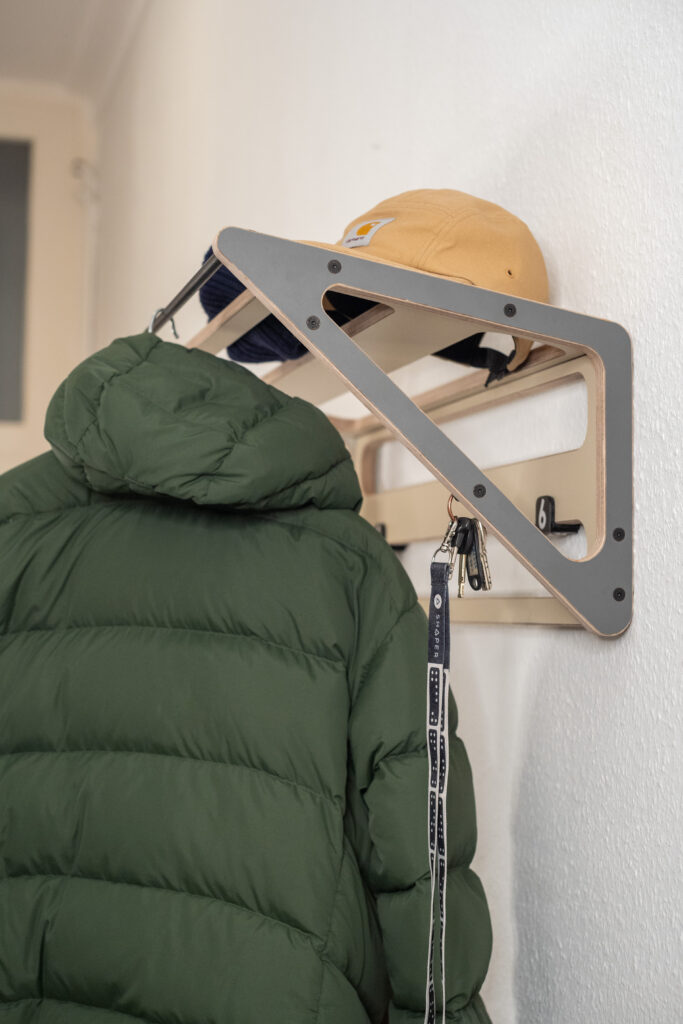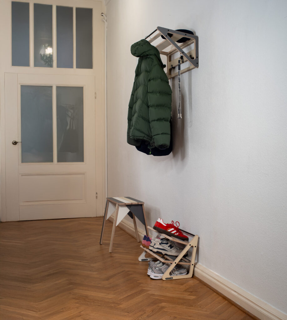 “System 6” ist ein modularer Bausatz für den Eingangsbereich. Die vier Bausatzelemente lassen sich je nach Wohnsituation zu einer Garderobe oder zu einem Schuhregal montieren. Aus dem Verschnitt der CNC-Fertigung entsteht eine Sitzbank. Dieses Projekt soll modellhaft zeigen wie man verschnittoptimierte Möbel flexibel gestalten kann.